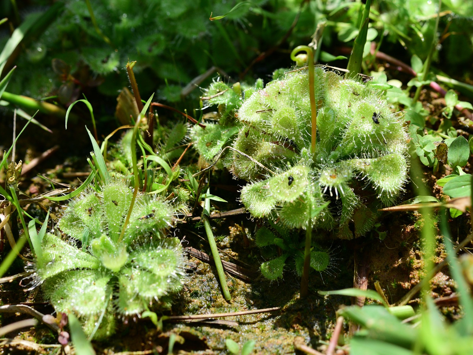 寬葉毛氈苔(Drosera burmanni)圓形葉片呈小巧的蓮座狀排列,這也使得誤入其間的昆蟲難逃一死。台灣主要分布於北部、東部和金門,嘉義亦曾有紀錄。它以捕食搖蚊、果實蠅、蟻等各種小型昆蟲補充氮素,提高生長與繁殖能力。作為濕生環境指標物種,其存在反映棲地的貧養狀態和生態健康。